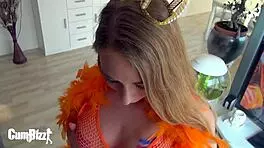 blonde teen in halloween costume gets caught and punished in rough garage threesome