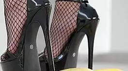 Petite Brunette Smashes Fruit with Sexy High Heels